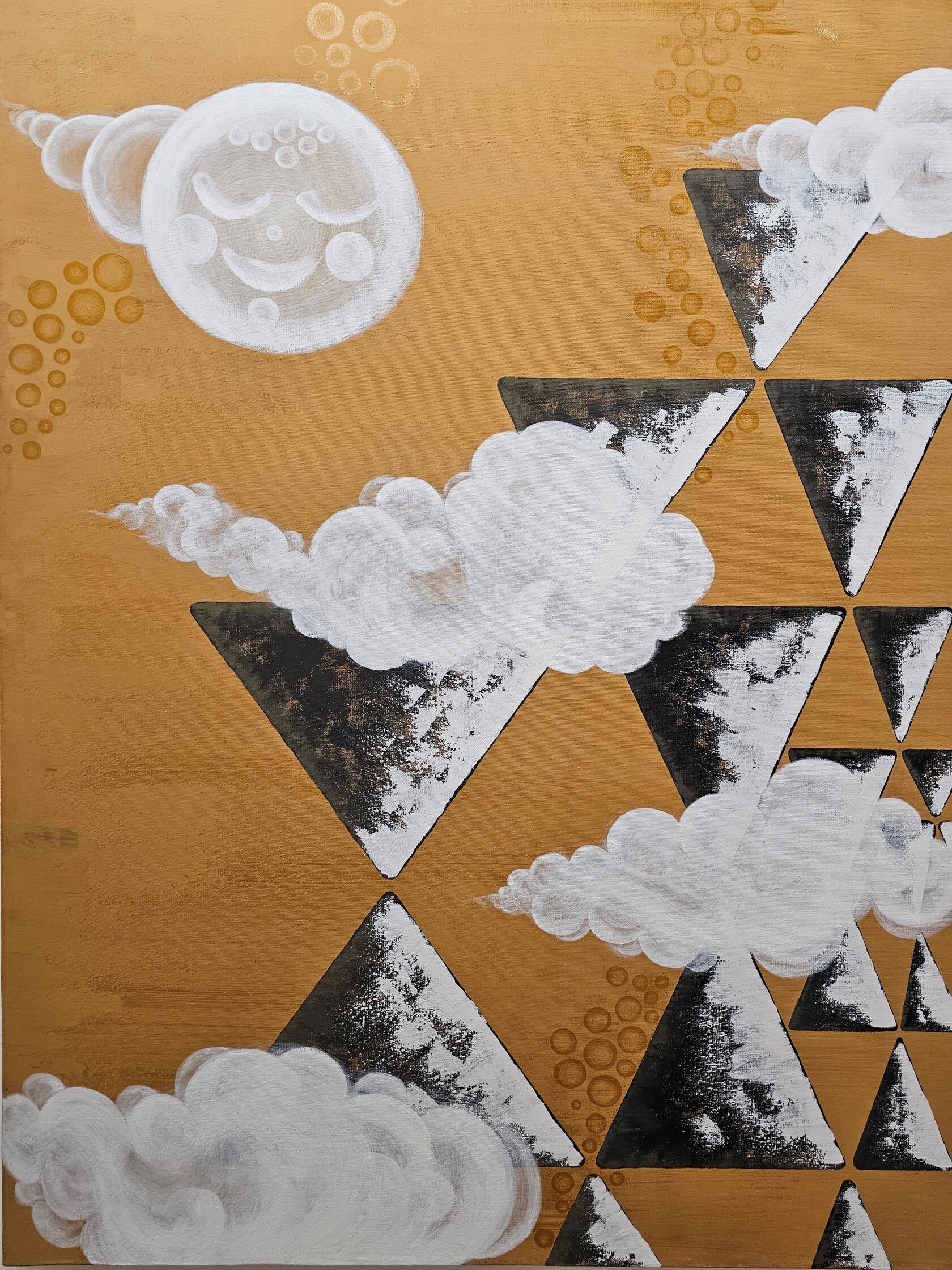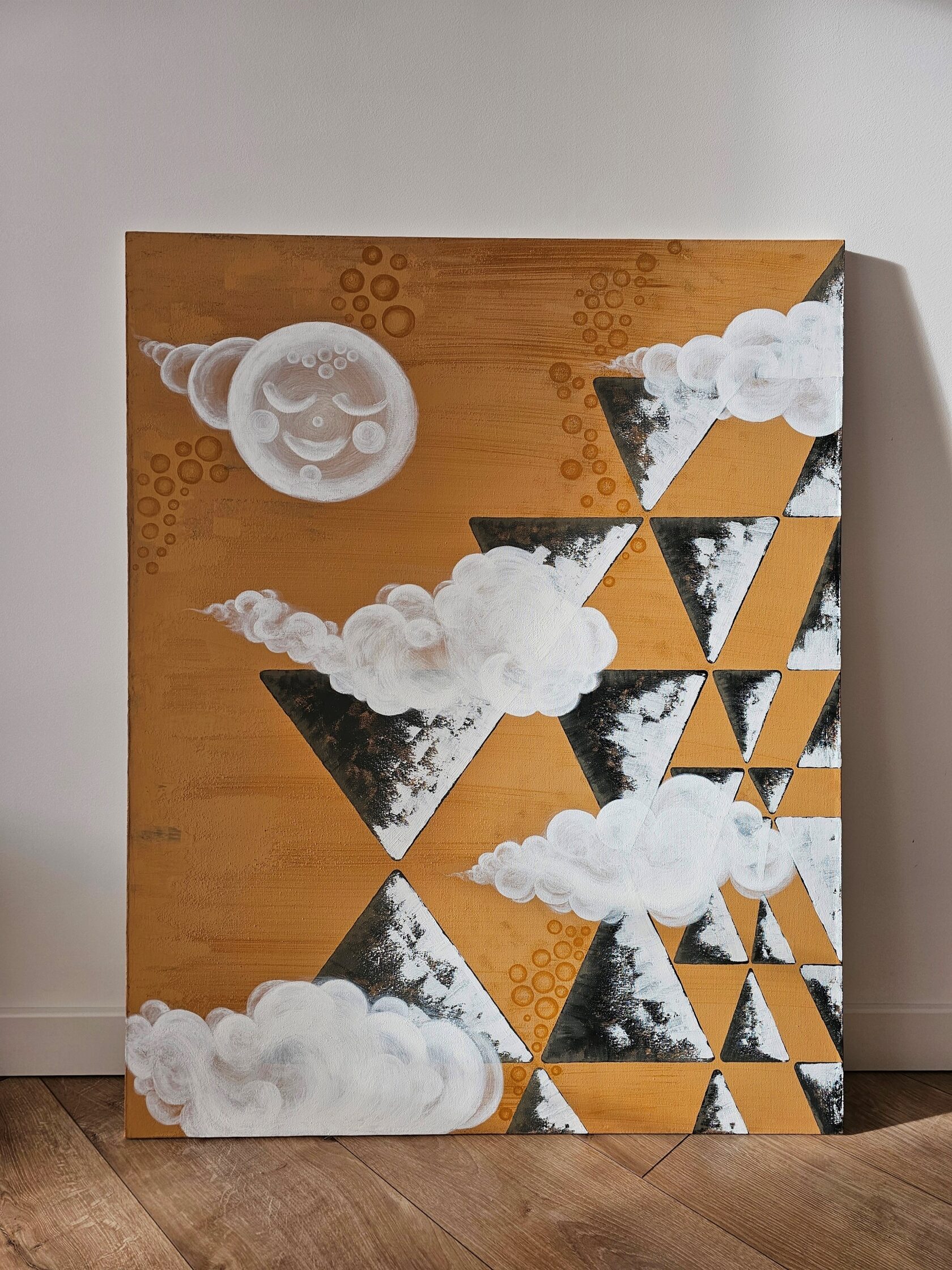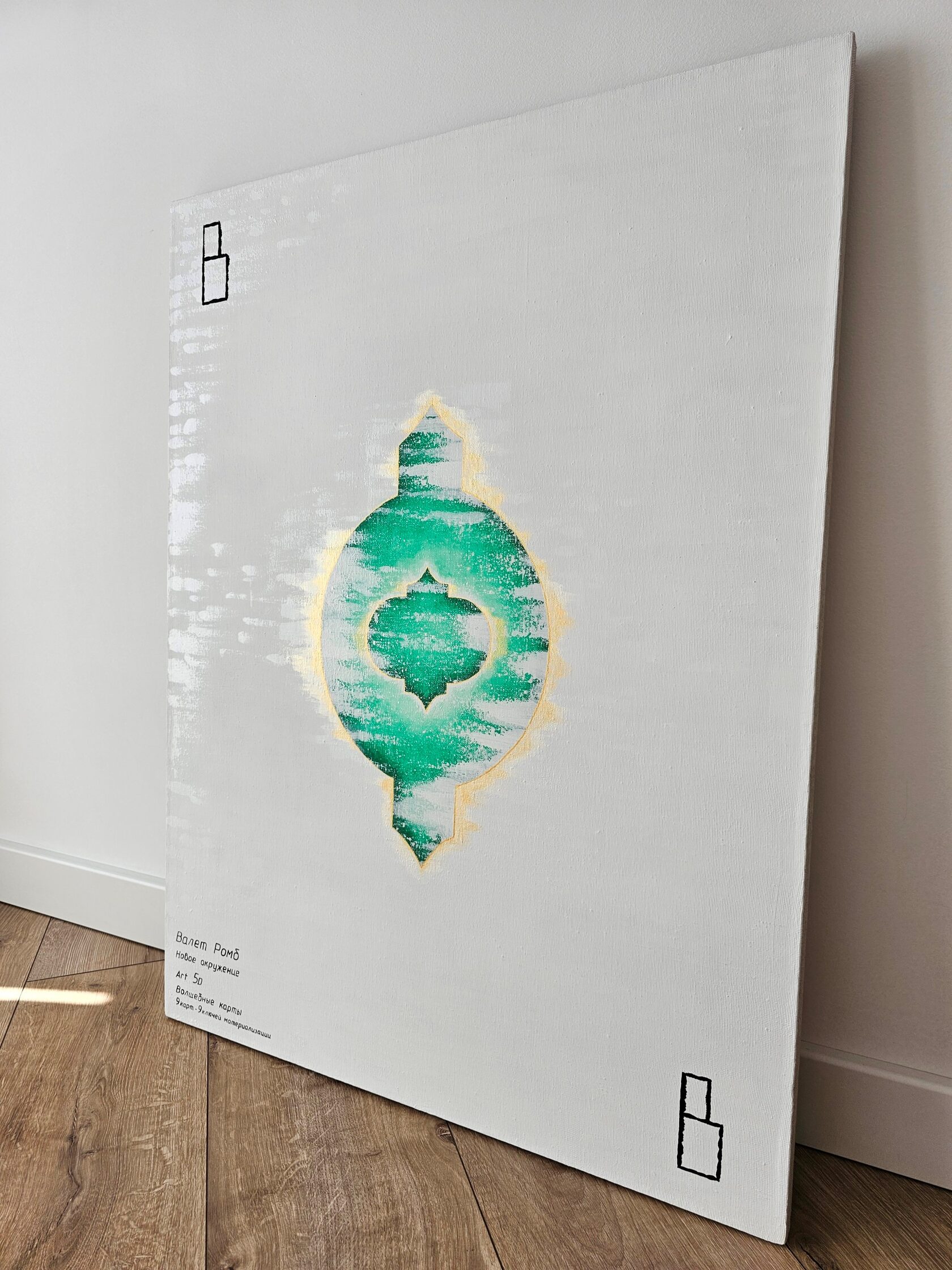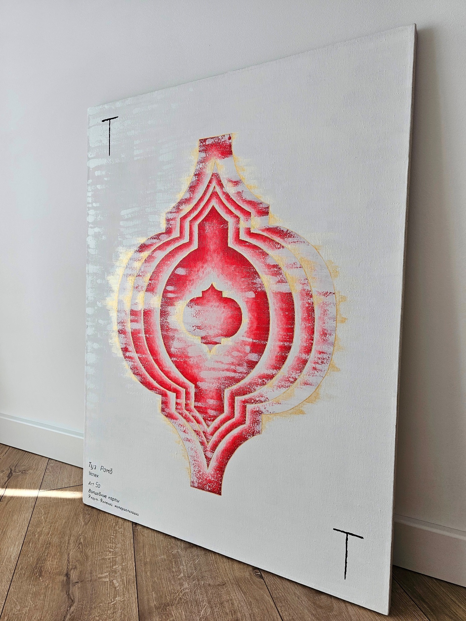 Ромбический орнамент и природные цвета становятся отправной точкой для визуальных экспериментов, где каждый элемент картины насыщается новыми смыслами и ассоциациями.